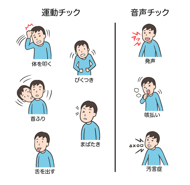 チック症は大きく「運動チック」と「音声チック」に分けられます。